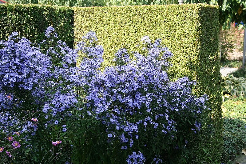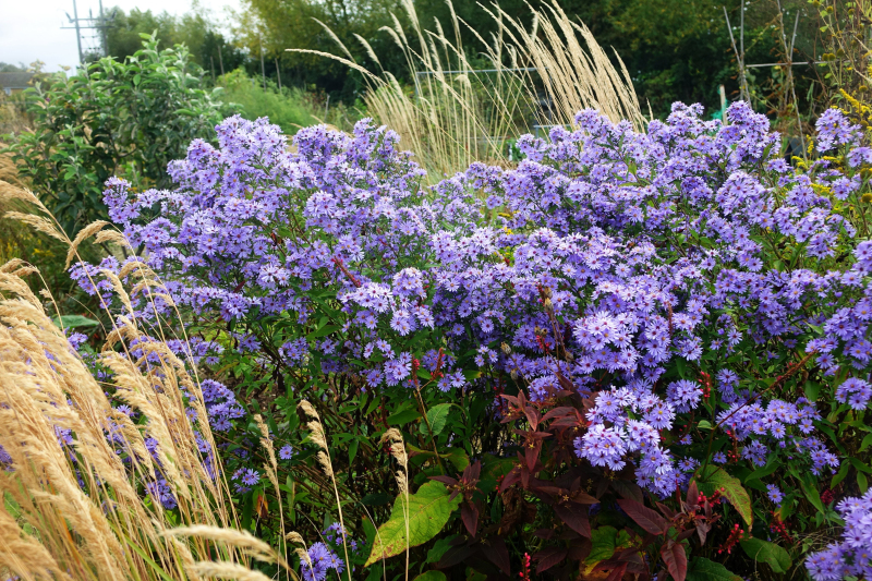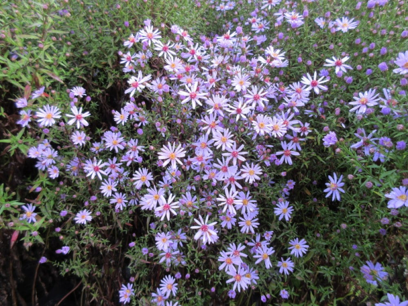 Aster cordifolius Little Carlow - Die Herzblättrige Aster ist eine der höheren Stauden mit auffälligen Spätsommerblüten, die bis zum ersten Frost halten. Die blassvioletten bis blauen Blüten sind ein angenehmer Kontrast zu der im Herbst vorherrschenden braun-orangenen Umgebung.