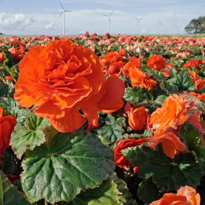 Tuberose Großblütige Begonie Orange ist eine Sorte mit riesigen gefüllten Blüten in einem warmen, leuchtenden Orange.