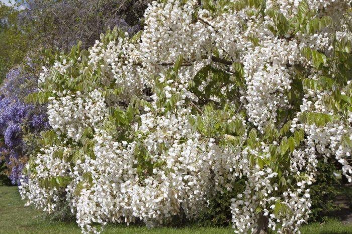 Die Sorte ‚Shiro-kapitan‘ (‚White Silk‘) begeistert mit schneeweißen Blüten, die ein zartes gelbgrünes Zeichen in der Blütenmitte tragen. Die kompakt wirkenden Blütenstände sind 15–30 cm lang, duften herrlich und erscheinen meist Mitte Mai.