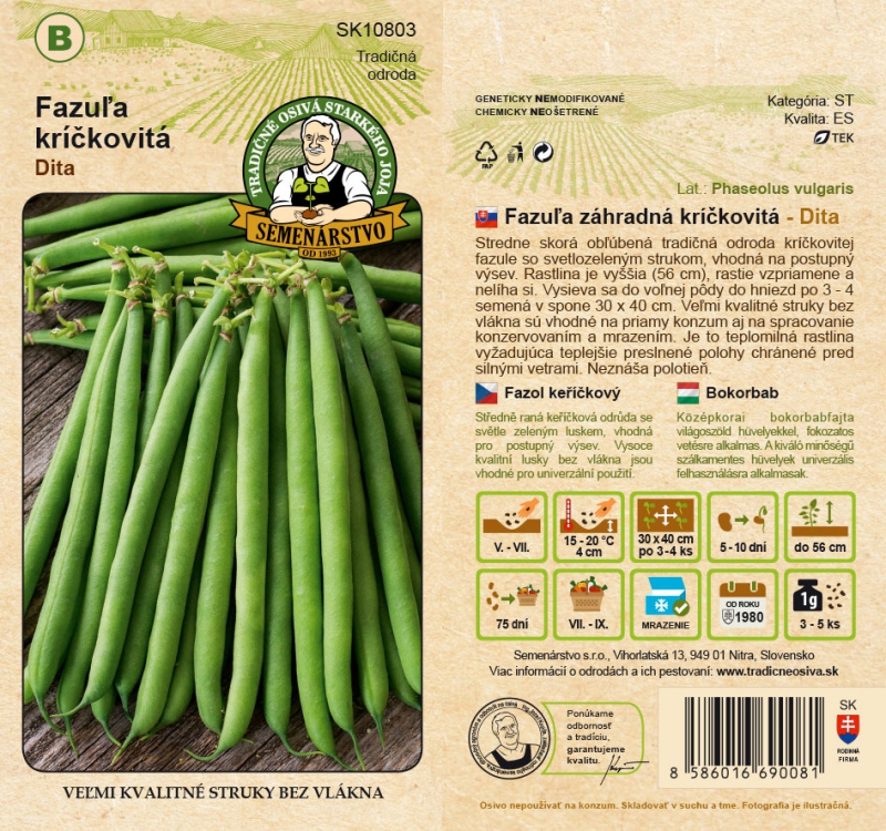 Sorte: BohnenMittelfrühe, beliebte, traditionelle Sorte von Buschbohnen mit hellgrünen Hülsen, geeignet für die aufeinanderfolgende Aussaat. Die Pflanze ist größer (56 cm), wächst aufrecht und legt sich nicht hin. Sie wird in offenem Boden in Nestern von 3-4 Samen in einem Gelege von 30 x 40 cm ausgesät. Die hochwertigen, faserfreien Schoten eignen sich für den direkten Verzehr sowie für die Verarbeitung durch Einmachen und Einfrieren. Es handelt sich um eine wärmeliebende Pflanze, die wärmere, sonnige und vor starkem Wind geschützte Standorte benötigt. Sie verträgt keinen Halbschatten.