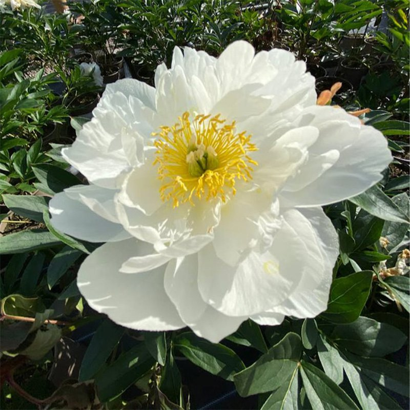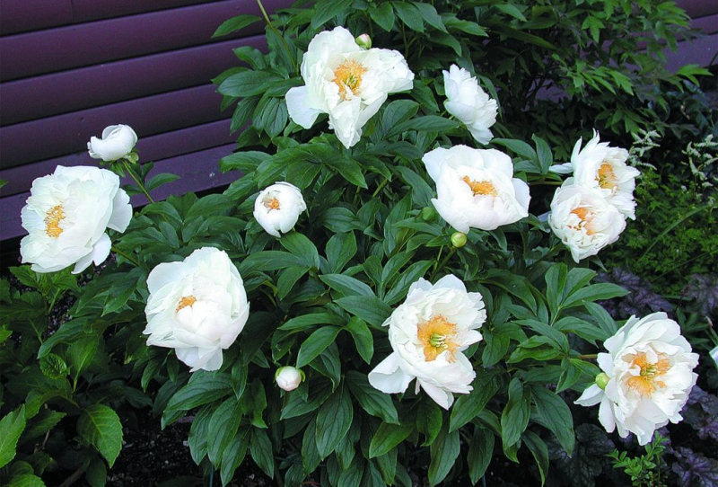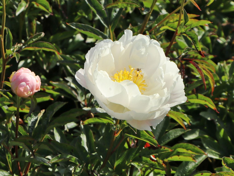 Chinesische Pfingstrose Miss America - Eine hohe Pfingstrose, die je nach Wachstumsbedingungen bis zu 120 cm hoch wird. Im Mai und Juni bringt sie große, halbgefüllte Blüten hervor, die sich aus rosa Knospen zu reinem Weiß mit goldgelben Staubgefäßen in der Mitte entwickeln. Sie duften zart und süßlich. Die kräftigen Stängel mit Knospen sind aufrecht und tragen typisch geteilte, dunkelgrüne Blätter.