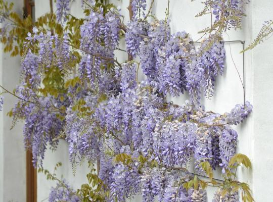Ein sommergrüner Kletterstrauch, der sich im Frühjahr mit seinen großen, leuchtenden blauen Blütenbüscheln mit einem sehr angenehmen Duft bemerkbar macht. Ihr süßer Duft wird seine Pracht noch verstärken. In der Blütezeit verliert sich sein hellgrünes Laub fast vollständig. Die duftenden Blüten locken Bienen an. Die ganze Pflanze ist giftig. Wenn man lernt, sie zurückzuschneiden, blüht sie noch üppiger - der Trick dabei ist, dass sie an "Stacheln" blüht, also an kurzen, seitwärts gerichteten Trieben. Schneiden Sie nach der Blüte den längsten Trieb stark zurück, die Seitentriebe auf 2-3 Blätter, und im Sommer schneiden Sie nur die seitlichen Stacheln auf dieselbe Weise zurück. Der Stamm wickelt sich im Uhrzeigersinn - nach rechts - um seine Stütze. Da es sich um eine Liane handelt, ist ihr Holz sehr biegsam und braucht viele Jahre lang eine starke Stütze.Diese Sorte blüht als kleine, 1 m hohe Pflanze.