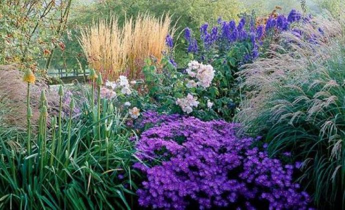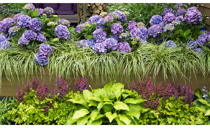 Die Kombination von Calico-Hortensien und Gräsern schafft eine gefüllte Fläche, die durch andere Stauden ergänzt wird.