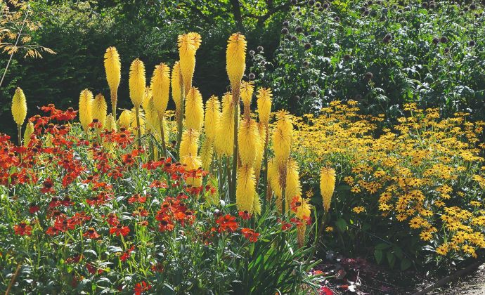 Kniphofia, auch Kleopatra-Nadel oder Vielblütler genannt, ist eine mehrjährige und winterharte Pflanze aus Südamerika. Helenium autumnale steht im Vordergrund des Beetes.