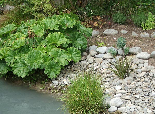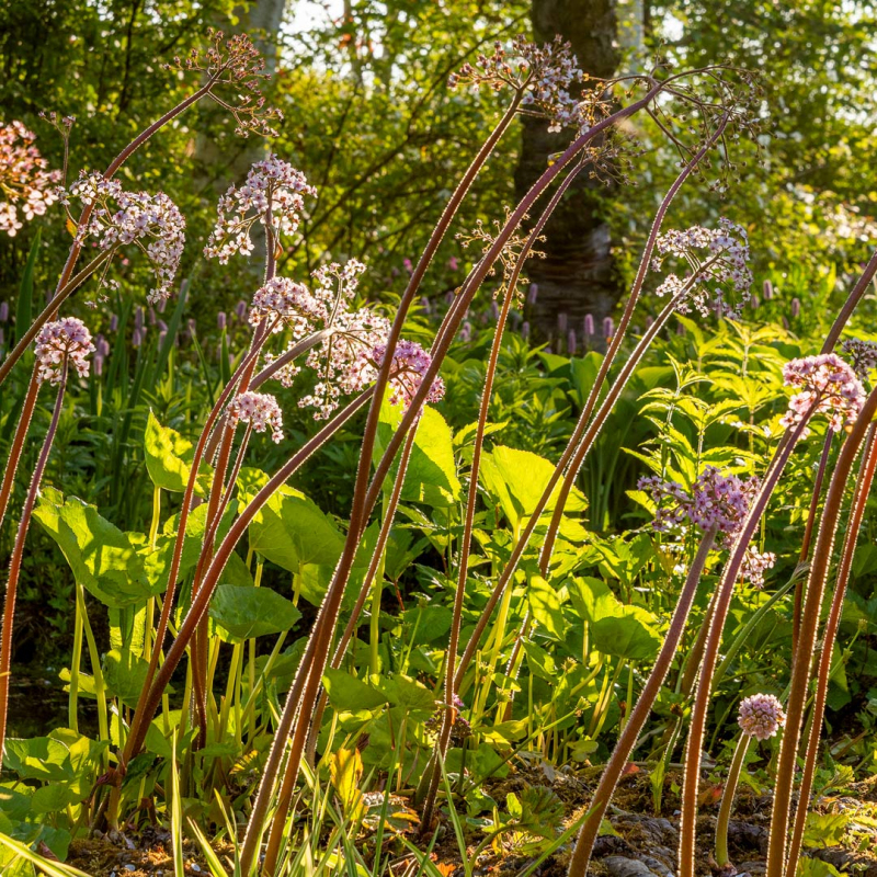 Darmera peltata (Indischer Rhabarber, Schirmpflanze) ist eine feuchtigkeitsliebende Staude, die in Oregon und Kalifornien heimisch ist. Sie erreicht eine maximale Höhe und Breite von 80-100 cm. Im Vergleich zu Gunnera ist dies ein großer Vorteil, da sie auch in kleinere Gärten integriert werden kann. Die ersten Blüten der Darmera sind blassrosa Blüten (in Form der Blüten von Bergenien), die im Frühsommer an langen, schmalen Stielen erscheinen. Dann beginnen sie, malerische, große, runde Blätter zu bilden, die bis zu den ersten Frösten halten.