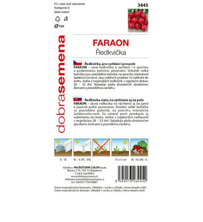 Spätes Radieschen zum Quicken und für den Feldanbau im Frühjahr und Herbst. Die mittelgroßen Zwiebeln sind regelmäßig kugelförmig und an der Oberfläche intensiv scharlachrot. Sie sind resistent gegen Rissbildung und Schossen. Einer der frühesten Radieschen mit einer Wachstumszeit von 28-32 Tagen. Er benötigt einen gut mit Nährstoffen versorgten Boden und regelmäßige Bewässerung.