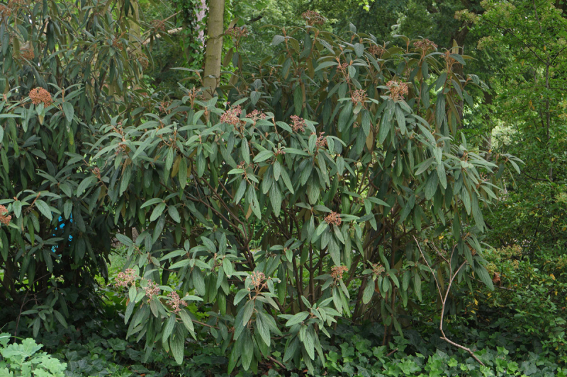 Es handelt sich um einen immergrünen, ausladenden Strauch mit großen, glänzenden, grünen und stark faltigen Blättern. Diese sind eiförmig und auf der Unterseite stark geädert und gefilzt. Die Blüten sind gelblich und blühen in filzigen, flachen Spitzen. Die Blütezeit erstreckt sich von Mitte Mai bis Juni. Die Frucht ist eine kleine rote Steinfrucht, die im Herbst reift und sich schwarz verfärbt.