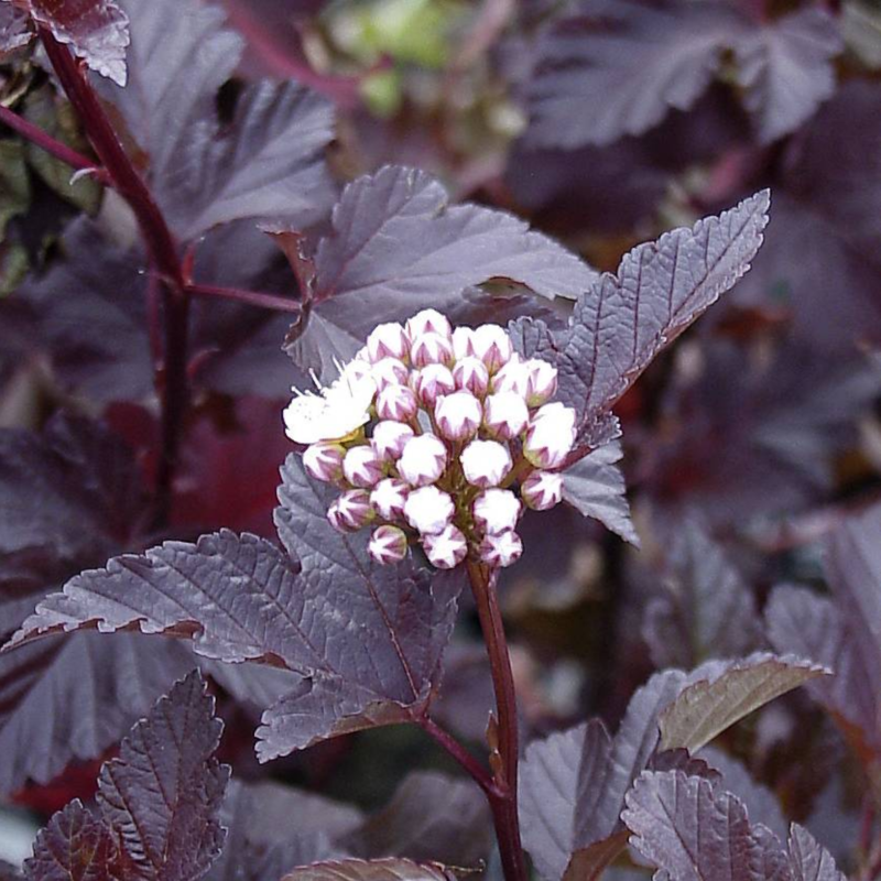 Schöner Zierstrauch, besonders wegen seiner burgunderroten Blätter. Er erreicht eine Höhe von 1,5-1,7m. Die kugelförmigen weißen Blüten blühen von Mai bis Juni. Er ist anspruchslos im Schnitt und eignet sich sowohl für Sonne als auch für Halbschatten und einen luftigen Boden.
