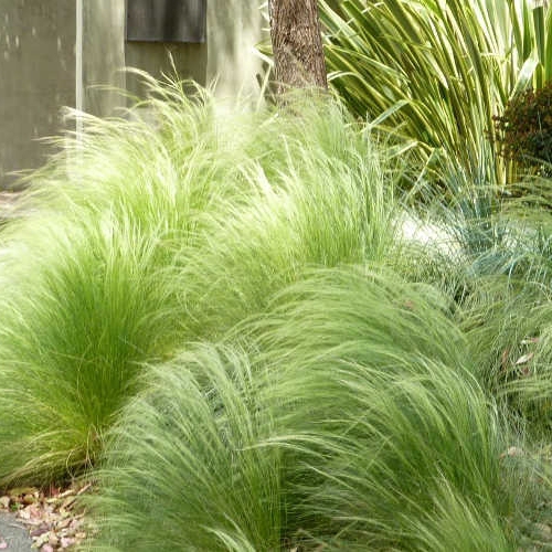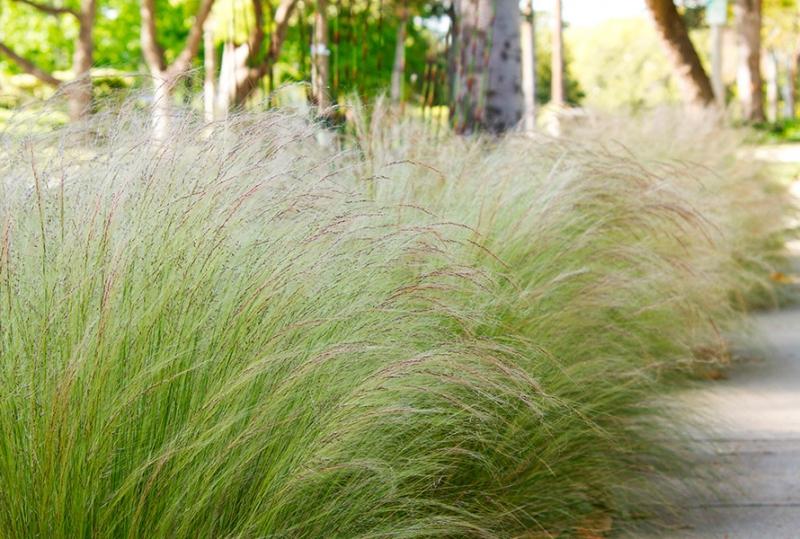 Ein Ziergras mit schmalen, faserigen Blättern, die sich wie Seide anfühlen. Cremeweiße zarte Blütenstände schmücken es von Juli bis August. Im Winter benötigt es Schutz durch Abdecken.