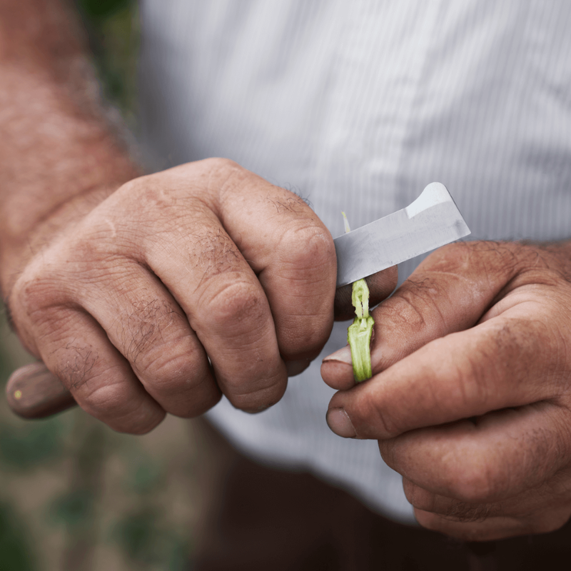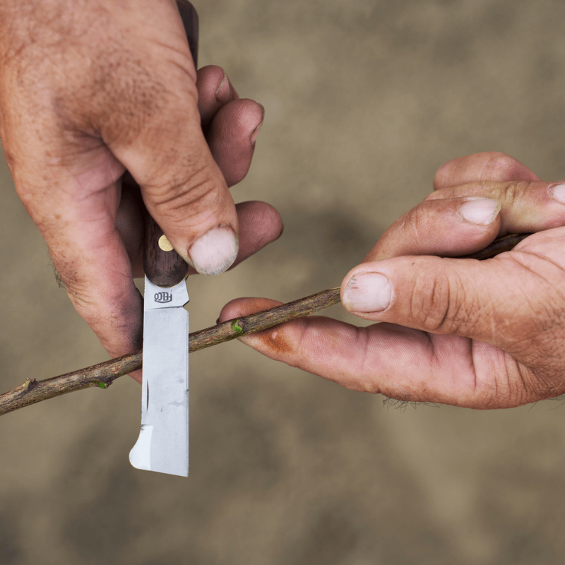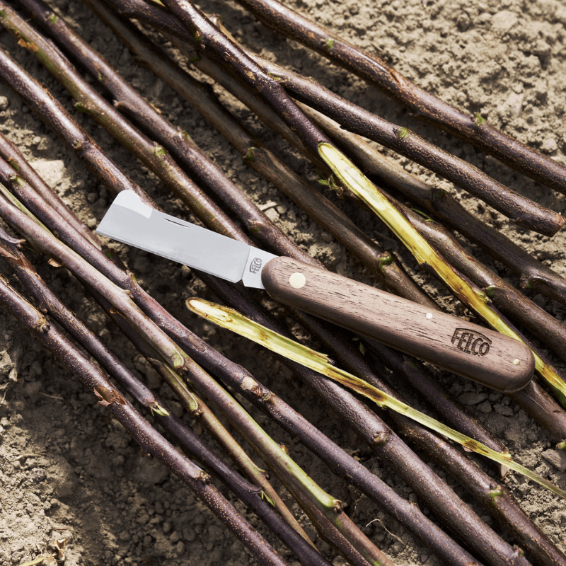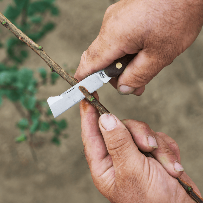 Premium-Profi-Pfropf- und Veredelungsmesser mit Rindenheber an der Oberseite der Klinge. Klinge aus hochwertigem Kohlenstoffstahl für einen sauberen Schnitt und unvergleichliche Präzision bei der Arbeit. Griff aus Nussbaumholz. Interne Messingauskleidung verhindert und schützt die Klinge vor Beschädigungen.