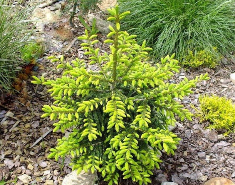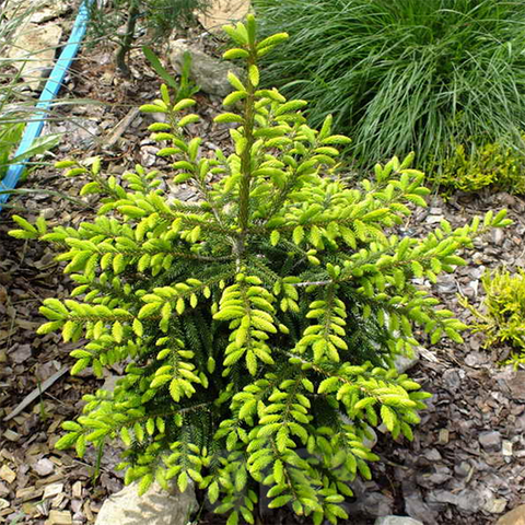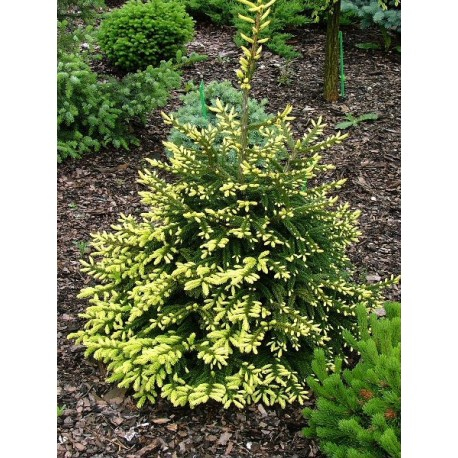 Sie ist breit kegelförmig, die Ähren sind fein, kurz, im Austrieb gelb, später grün nachdunkelnd. Sie bevorzugt einen feuchten, sonnigen Standort und einen gut durchlässigen Boden. Diese Zwergfichte eignet sich am besten als Solitär in kleinen Räumen, Vorgärten oder als Dominante in Steingärten oder in der Heide.