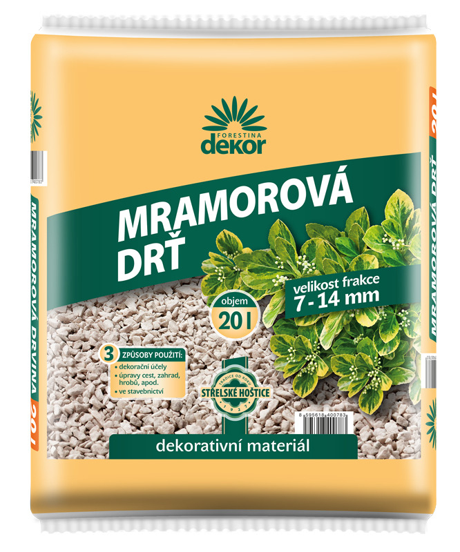 Forestina DEKOR Marmorsplitt 7-14mm - 20l.Marmorsplitt ist für dekorative Zwecke im Innen- und Außenbereich geeignet. Er kann für die Gestaltung von Wegen, Stegen und Gedenkstätten oder zur Abgrenzung von Flächen in Ziergärten verwendet werden. Er dient auch als Dekoration für Terrassenkübel und Pflanzgefäße. Körnung: 7 - 14 mm. Zutaten: weißer gebrochener Marmorkiesel