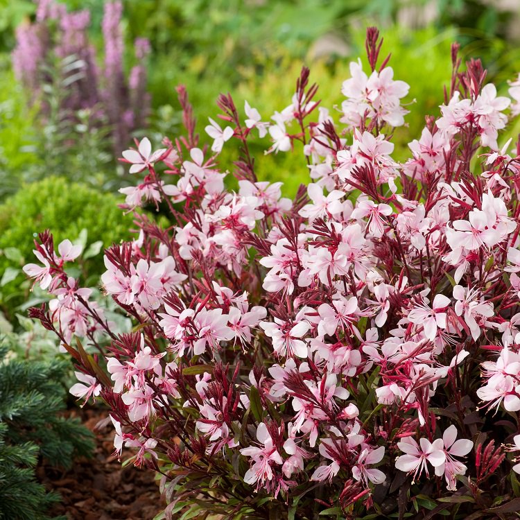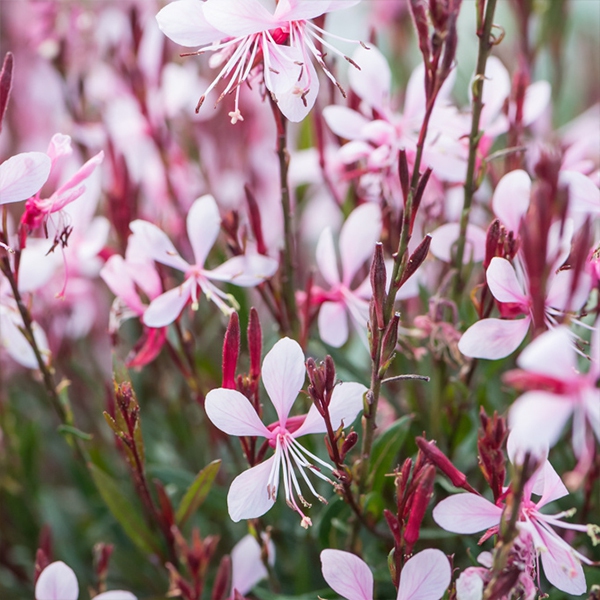 Eine sommerblühende Staude mit einer flauschigen Textur und Blüten, die Schmetterlingen ähneln. Ab dem Hochsommer lockt sie Insekten an und zieht die Blicke der Liebhaber von blühenden Gärten auf sich. Die Sorte Graceful Light Pink ist kompakt und mit einer Höhe von 30-40 cm deutlich kleiner als die Grundart Gaury. Hervorragend geeignet für eine abwechslungsreiche Bepflanzung in mobilen Behältern, Töpfen und Pflanzgefäßen.