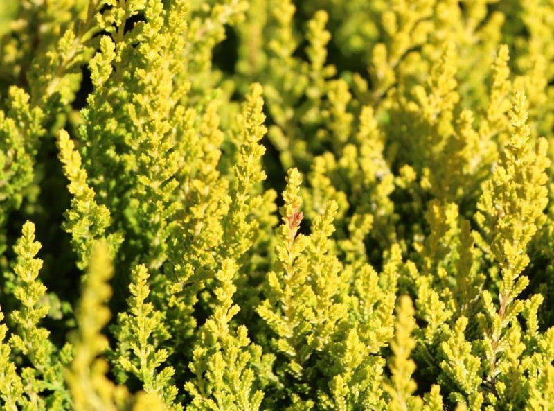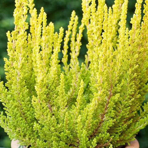 Eine kompakte, nicht blühende Form des Heidekrauts, dessen Blätter eine auffällige goldgelbe Färbung haben, die an Nadeln erinnert. Sie bildet einen kleinen Zierstrauch, der eine Höhe von etwa 30-35 cm erreicht. Das Heidekraut bevorzugt einen sonnigen Standort. Sie brauchen einen sauren und nährstoffreichen Boden. Heidekraut benötigt einen Frühjahrsschnitt, um einen dichteren Strauch zu bilden und üppiger zu blühen.