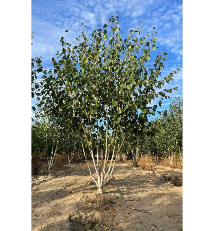 Die Himalaya-Birke Jacquemontii ist ein sommergrüner Baum, der in Bergwäldern und an felsigen und steinigen Hängen wächst. Sie zeichnet sich durch ihre reinweiße, glatte Rinde und die einzigartige Blattfärbung aus - im Herbst färben sich die dunkelgrünen Blätter leuchtend gelb.