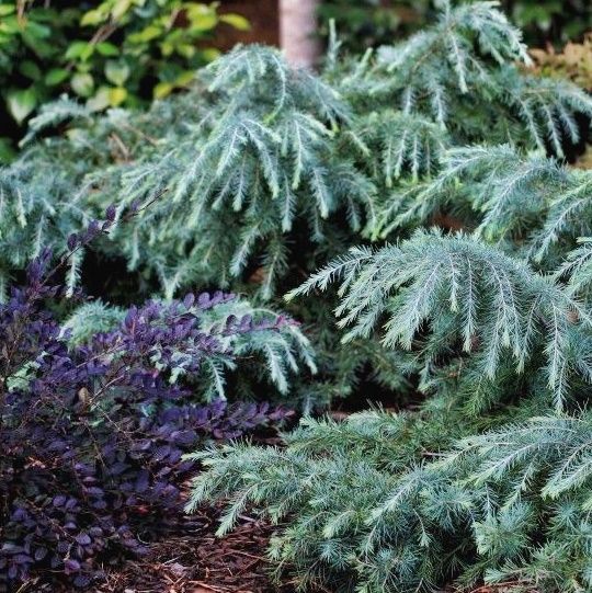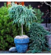 Dies ist eine schöne, beliebte, niedrig wachsende Konifere. Die Höhe hängt von der Anbaumethode ab und erreicht eine Höhe von 1,5-1,8 m. Es ist eine immergrüne, langsam wachsende Zeder mit weit ausladenden Zweigen von silberblauer Farbe.