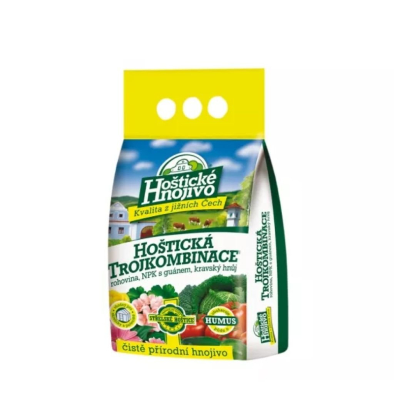 Hostic Triple Combination ist eine einzigartige Mischung aus natürlichen organischen Inhaltsstoffen - gemahlenem Horn, natürlichem NPK mit Guano und granuliertem Kuhmist. Es ist vor allem für die Grunddüngung des Bodens in Gewächshäusern, Treibhäusern und Blumenbeeten bestimmt. Es erhöht den Humusgehalt im Boden und füllt die fehlenden Grundnährstoffe und Spurenelemente auf. Da es sich um einen rein natürlichen organischen Bestandteil handelt, ist die Hoštická Dreifachkombination besonders für den Anbau von Gemüse und Obst geeignet.