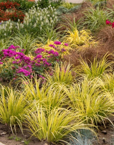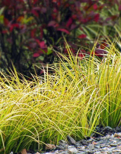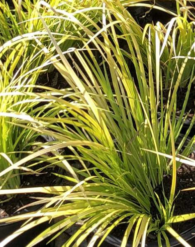 ‚Golden Delight‘ ist eine besonders attraktive, immergrüne Sorte mit hohem Zierwert. Die schmalen, hellgrünen Blätter sind mit einem markanten gelben Streifen versehen und bilden dichte, elegant gefächerte Büschel. Im Mai schmückt sich die Pflanze mit grünlich-gelben, ährenförmigen Blüten. Ideal als Strukturpflanze im Beet, für Steingärten oder als Blickfang im Kübel.