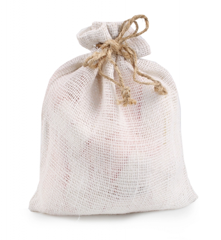 Der cremefarbene Jute-Geschenksack lässt sich leicht mit einem Kordelzug verschließen.