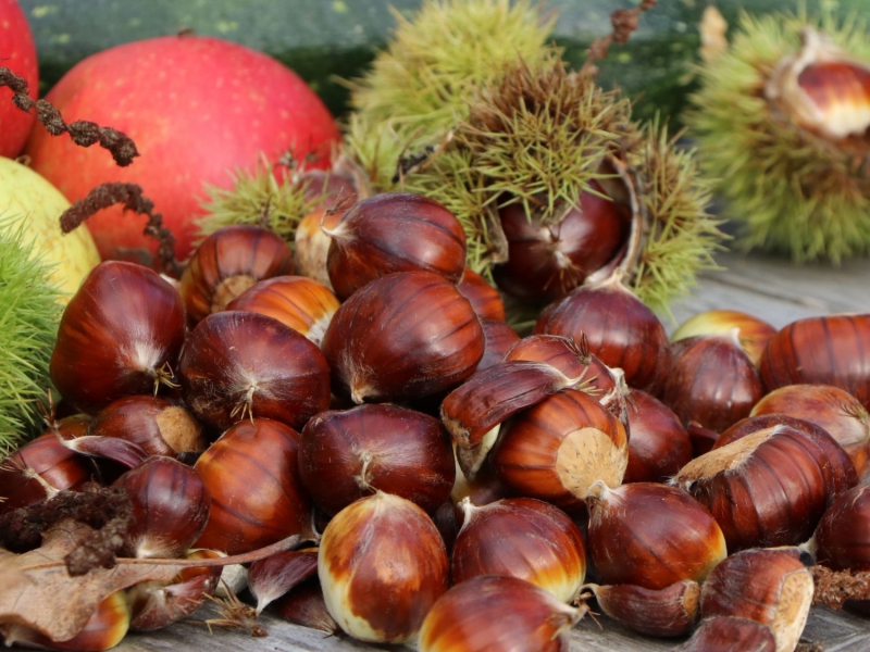 Eine sehr beliebte Esskastanie. Die Sorte Lyon ist eine zuverlässige französische Sorte, die schon in jungen Jahren (2-3 Jahre) Früchte trägt. Der Baum selbst hat einen kompakten Wuchs und erreicht eine Höhe von 4-7 Metern bei der Reife. Lyon ist selbstbestäubend (ein Baum produziert sowohl männliche als auch weibliche Blüten). Er blüht im Juni-Juli mit sehr hübschen Trauben aus cremeweißen Blüten. Er hat längliche dunkelgrüne Blätter, die sich im Herbst leuchtend gelb färben. Ab Juni trägt er essbare Früchte mit einer schälbaren Schale.