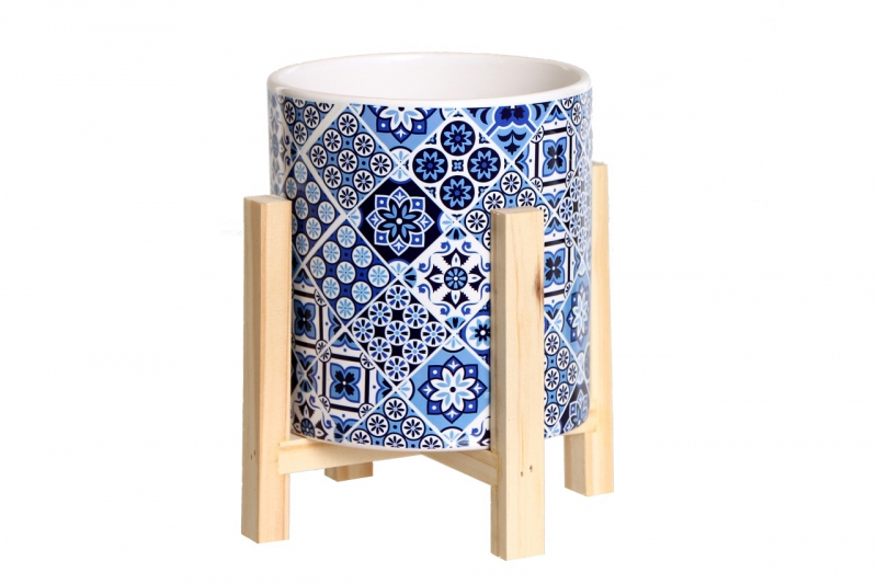 Keramischer Pflanztopf im Holzständer