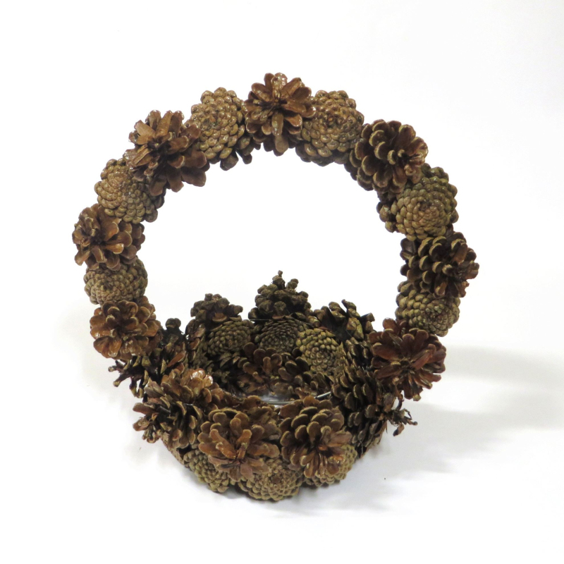 Korb aus natürlichen Kiefernzapfen. Maße ca. Durchmesser 25cm, Höhe 30cm. Sie können ihn ohne Ornamente verwenden, oder verschiedene Schmuckstücke, Früchte, Blumen, Bänder hinzufügen. Ideal für Frühlings-, Herbst- und Weihnachtsarrangements.
