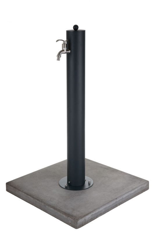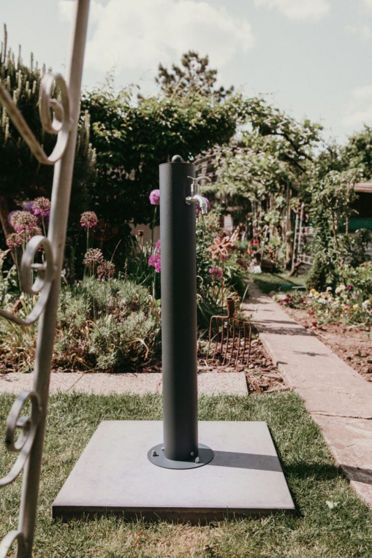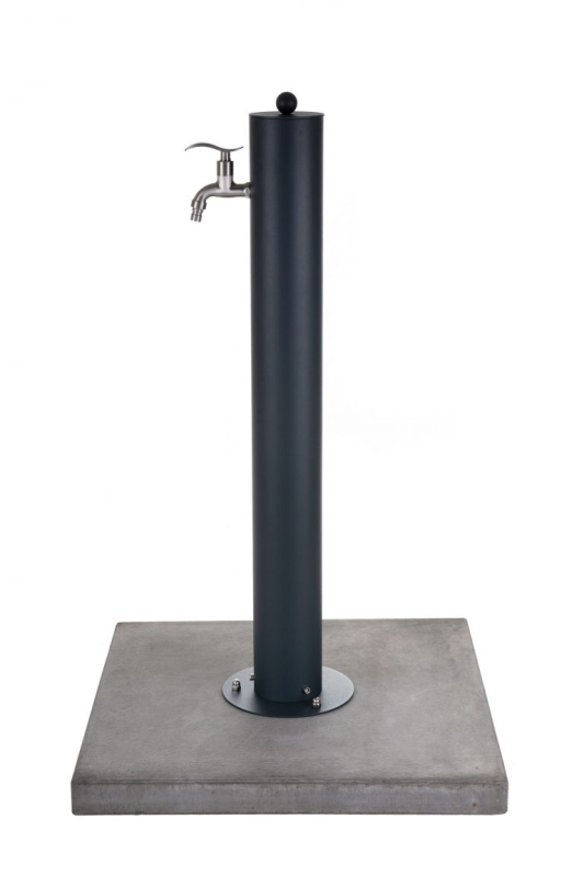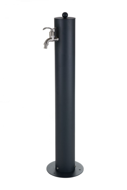 Rundes Modell der Wassersäule in Anthrazit (RAL 7016). Wie die anderen Edelstahlsäulen in unserem Sortiment ist auch diese komplett aus Edelstahl AISI 304 gefertigt und seine Oberfläche wird anschließend mit einer feinen Textur pulverbeschichtet. Wir liefern das Produkt komplett montiert, um die Montage so einfach wie möglich zu gestalten.
