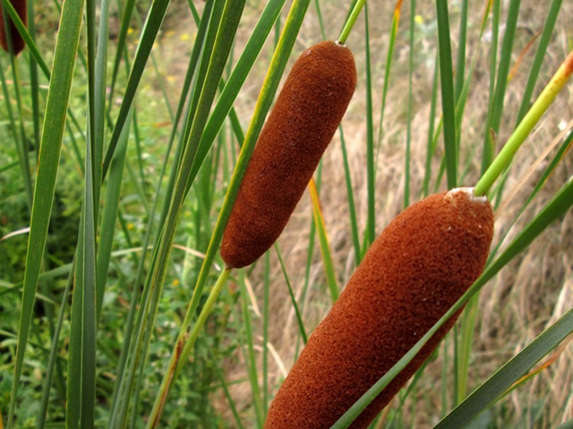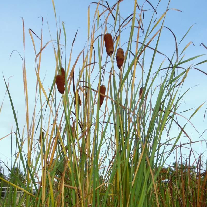 Typha laxmannii - eine kleinere Fledermaus, die sich für flache Teichränder in Sonne und Halbschatten eignet. Sie kann auch in kleine Teiche gepflanzt werden, sie ist nicht ausbreitungsfähig. Sie erreicht eine Höhe von 100-130 cm. Kleine braune Fledermäuse erscheinen im Juli und bleiben bis zum Winter an den Stämmen.