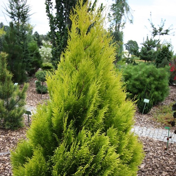 Vor dem Winter, wenn die Temperatur unter 5°C sinkt, nimmt er eine auffällige goldene bis orangefarbene Färbung an den Enden der Zweige an, die bis zum Tauwetter im Frühjahr anhält. Ein weiteres attraktives Merkmal sind die orange-roten Zweige der jungen Triebe. Er wächst langsamer, etwa 20 cm pro Jahr.