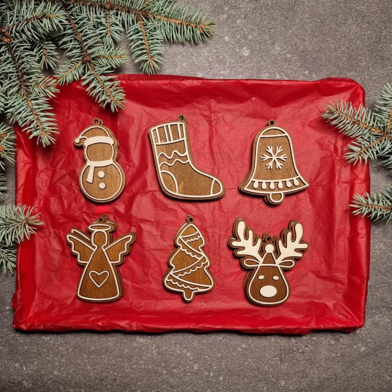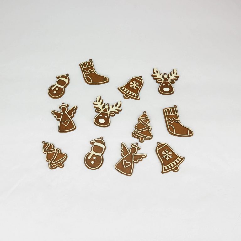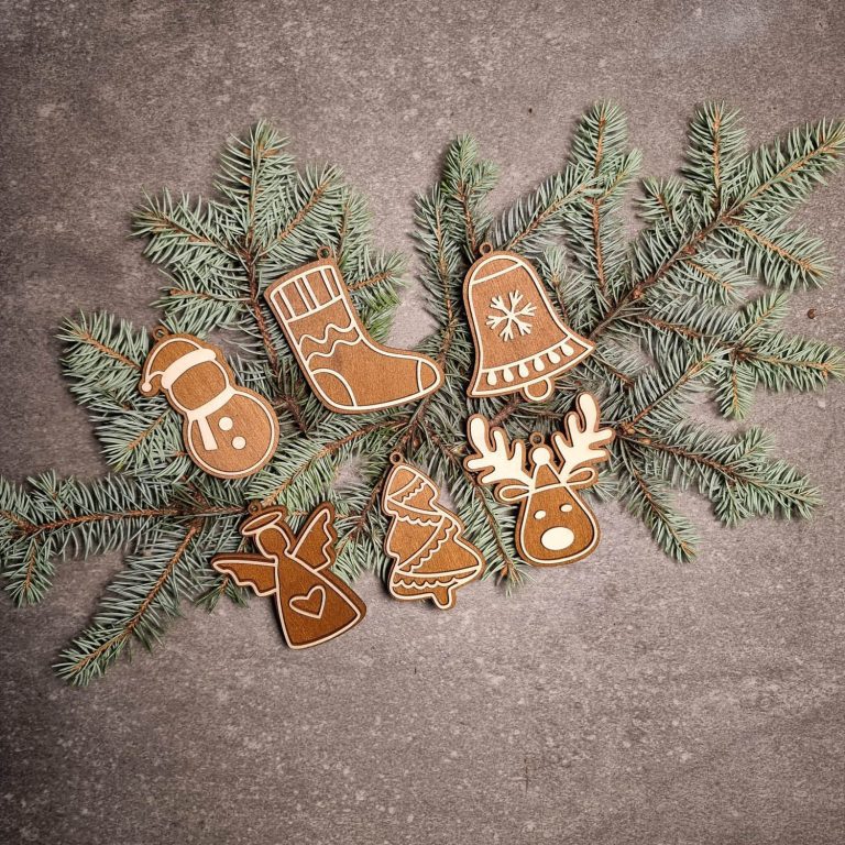 Laser-geschnitzte Ornamente aus einer Kombination von gebeiztem und ungebeiztem Sperrholz.