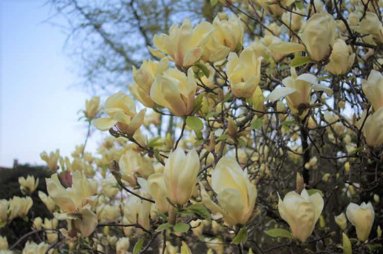Magnolia YELLOW LANTERN ist ein kleiner bis mittelgroßer Laubbaum, der Mitte des Frühjahrs leuchtend zitronengelbe tulpenförmige Blüten hervorbringt.