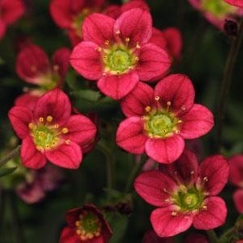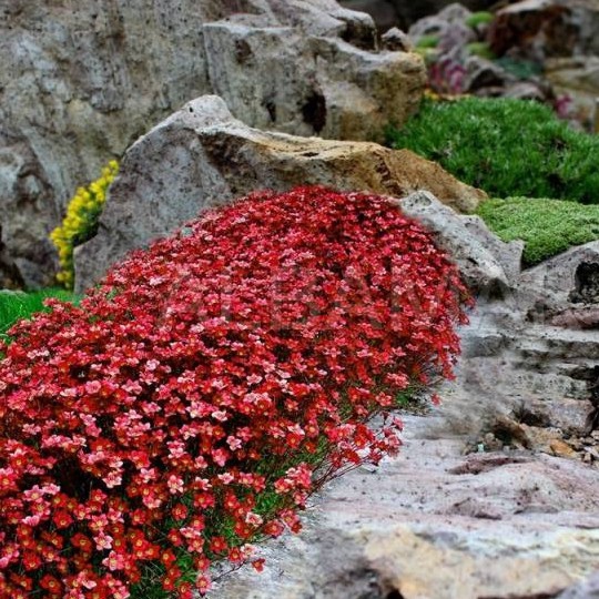 Blütenfarbe: rot Blattfarbe: grün Pflanzentyp: Steingarten Bildet dichte Polster, aus kleinen Blattrosetten.