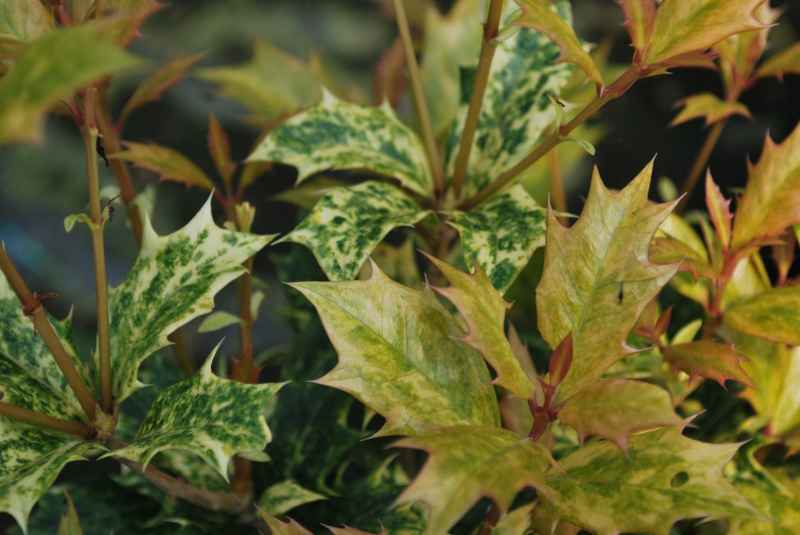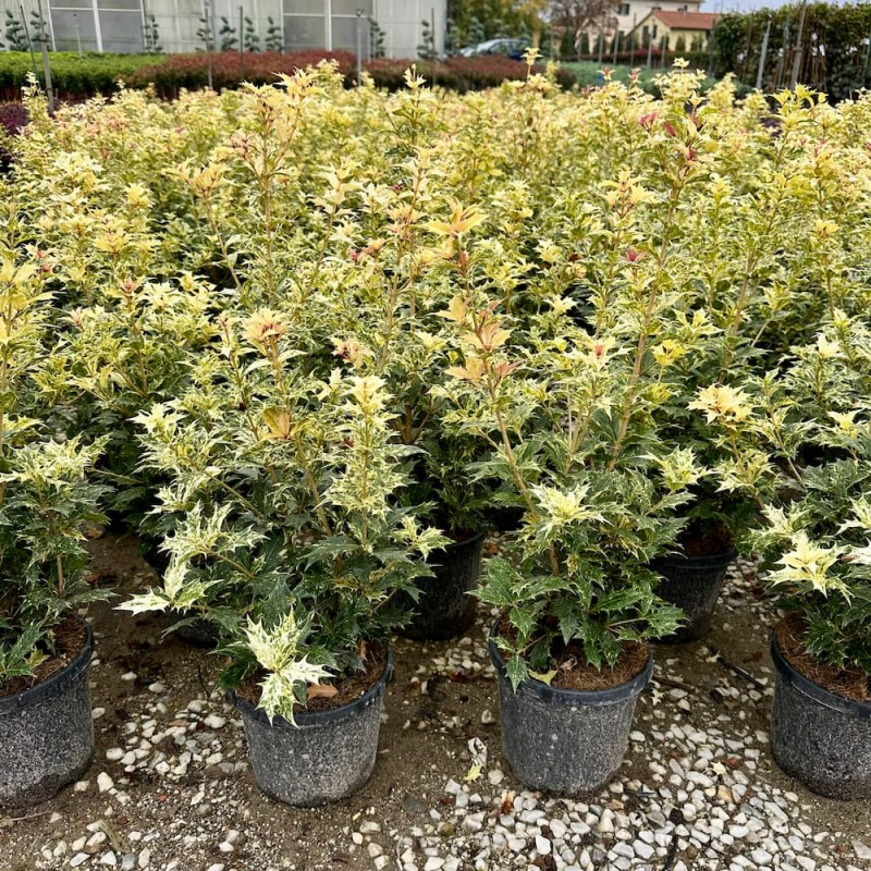 Es handelt sich um einen immergrünen Zierstrauch, der bis zu 1-2m hoch wird. Osmanthus various-leaved Goshiki wird auch falsche Stechpalme oder auch Duftblume genannt. Er hat gelbgrüne, in der Jugend rosafarbene Blätter mit spitzen, stacheligen Rändern. Sie gedeiht in feuchtem, luftigem, saurem Boden, Sonne und Halbschatten.