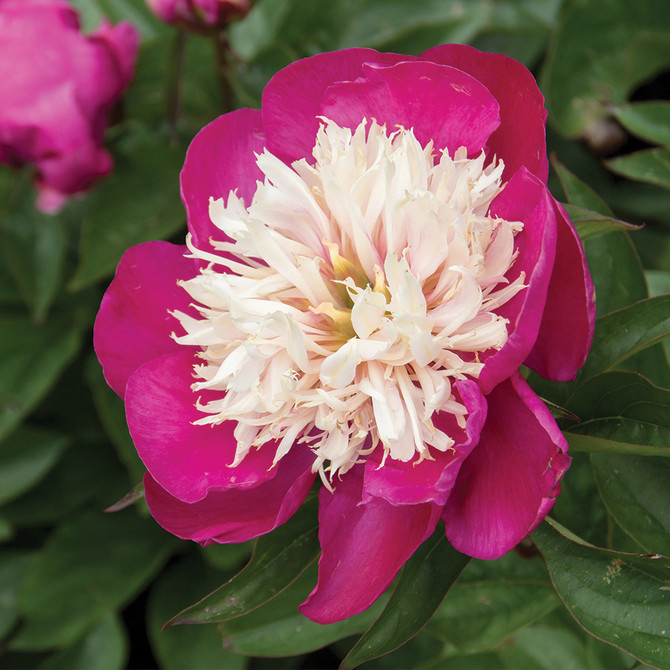 Die Weißkappen-Pfingstrose hat große, rosarote Blüten mit vielen cremeweißen, nadelförmigen Blütenblättern in der Mitte, die sich im Laufe der Saison rosa färben können. Der atemberaubende Kontrast von Rot und Weiß leuchtet im Garten und zieht die Blicke der Besucher auf sich.