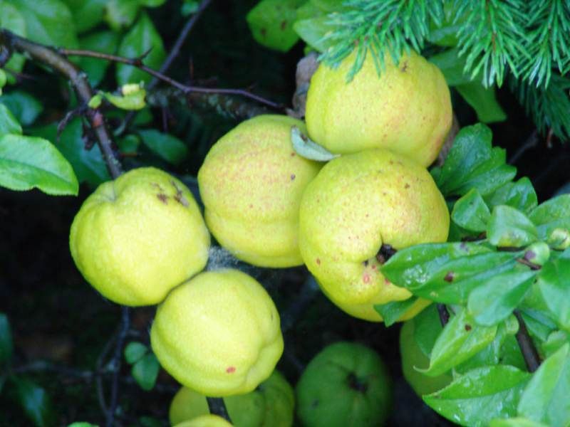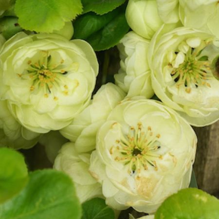 Kinshiden ist eine einzigartige Zwergsorte mit großen, halbgefüllten Blüten in zartem Grüngelb. Sie öffnen sich im zeitigen Frühjahr, wenn das Wetter wärmer wird, in der Regel ab Mitte April, aber bei einem warmen Spätwinter können sich die Knospen auch schon im März öffnen. Die Blütezeit dauert recht lange, und die Sträucher stehen noch im Mai in voller Blüte. Nach der Blüte bilden sich die niedlichen, unförmigen, aber sehr aromatischen, grünlich-gelben Früchte, eher am älteren Holz im Inneren des Strauches. Sie reifen im Oktober.