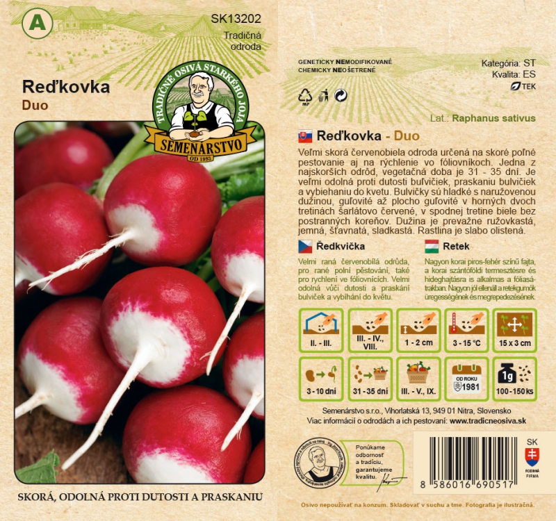 Sorte: RettichEine sehr frühe rot-weiße Sorte für den frühen Feldanbau und für die Befruchtung im Gewächshaus. Eine der frühesten Sorten mit einer Wachstumszeit von 31-35 Tagen. Sie ist sehr widerstandsfähig gegen das Aushöhlen der Knollen, das Aufplatzen der Knollen und das Schossen. Die Knollen sind glatt mit rosafarbenem Fleisch, kugelförmig bis flachkugelförmig in den oberen zwei Dritteln, scharlachrot, weiß im unteren Drittel, ohne Seitenwurzeln. Das Fruchtfleisch ist überwiegend rosafarben, zart, saftig, süßlich. Die Pflanze ist schwach laubabwerfend