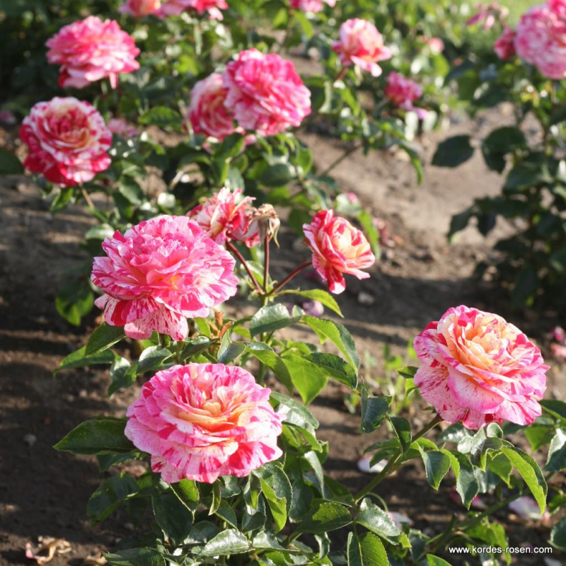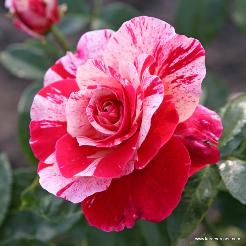 Rose Abracadabra ist eine mehrblütige Rose, sie hat gefüllte Blüten mit einer unregelmäßigen Melange aus roten und weißen Blüten.