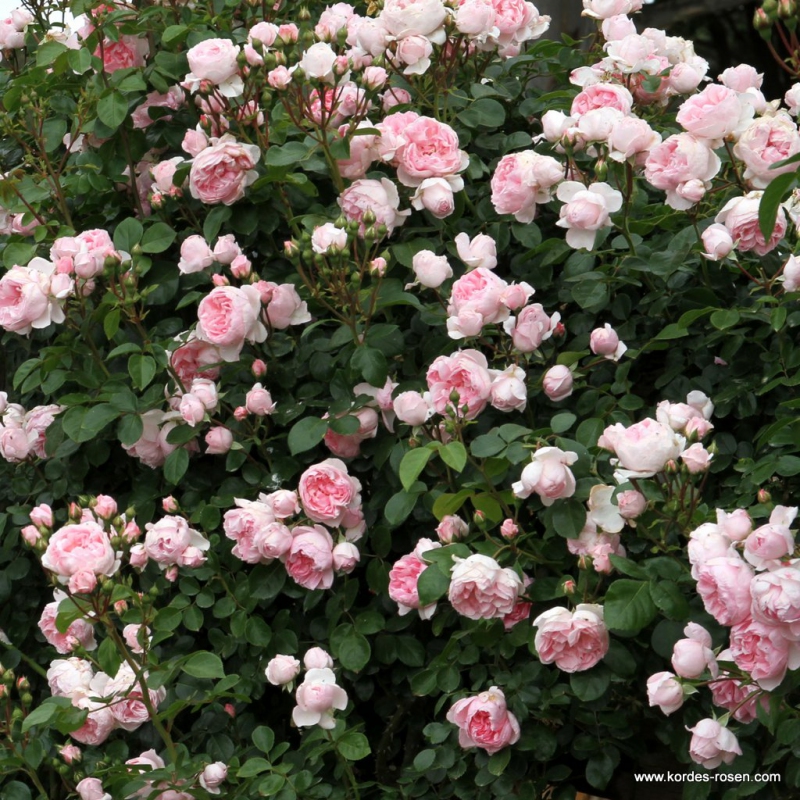 Busch in einem schönen zarten Rosa, mit dem Charme der alten Rosen.
