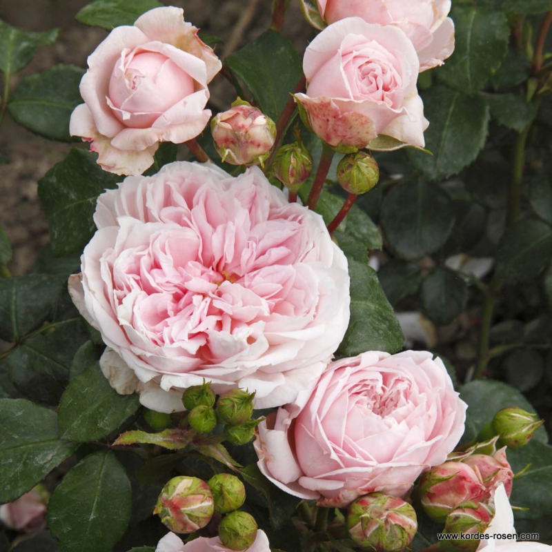 Busch in einem schönen zarten Rosa, mit dem Charme der alten Rosen. Er ist mit sehr gesundem Laub und einer nostalgischen Blütenform ausgestattet, die in Baden-Baden, Genf und Rom mit Goldmedaillen ausgezeichnet wurde.