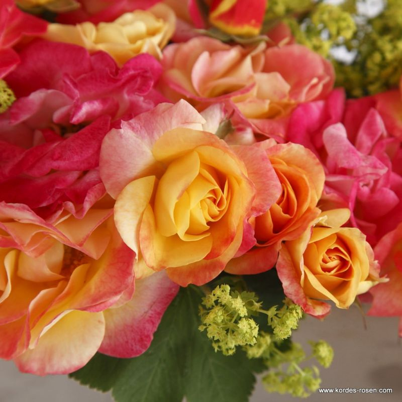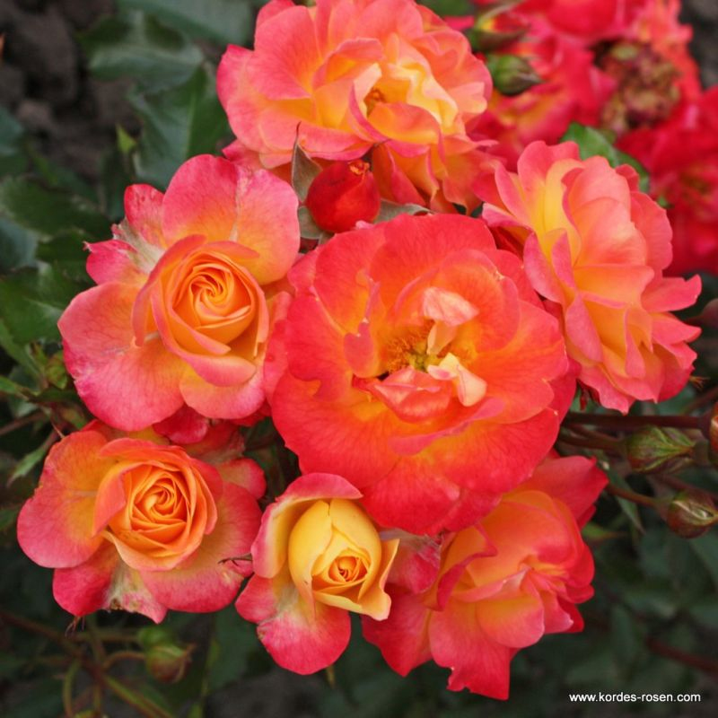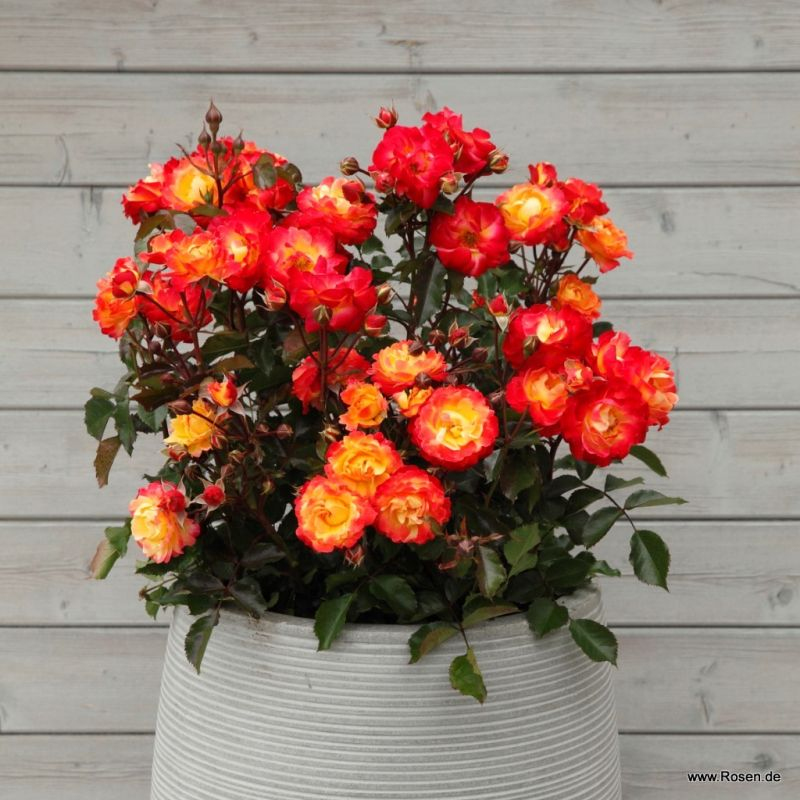 Firebird ist eine prächtige, mehrblütige Rose in einer Kombination aus leuchtendem Rot und Orange, die buchstäblich den Eindruck eines lodernden Feuers vermittelt. Die Firebird-Rose von Kordes blüht wiederholt als aufrechter Strauch, der eine Höhe von 70 cm und eine Breite von 50 cm erreicht. Ausgezeichnete Krankheitsresistenz.
