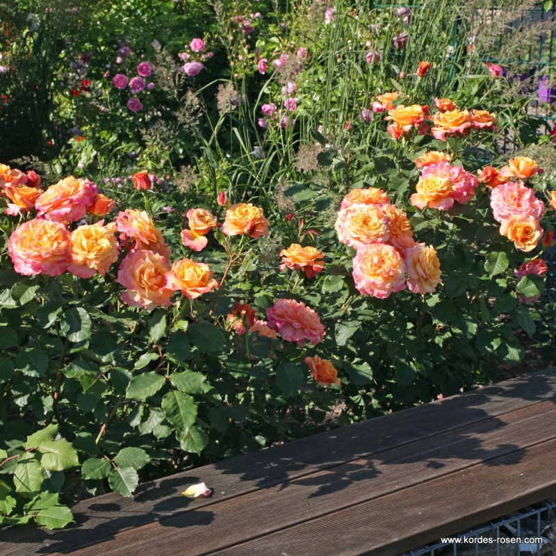 Eine Kronenrose mit stark gefüllten, eleganten Blüten, immer in Büscheln. Sehr stabile Farbe, nostalgische Blüten und zarter Duft. Benannt nach dem Gartenfestival La Villa Cotta.