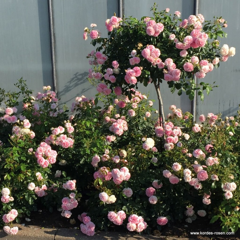Die bodendeckende Sorte Larissa hat zarte Blüten in zartem Rosa, die sich zu reichen Blütenkugeln entwickeln, die in ihrer Form an Pfingstrosen erinnern.