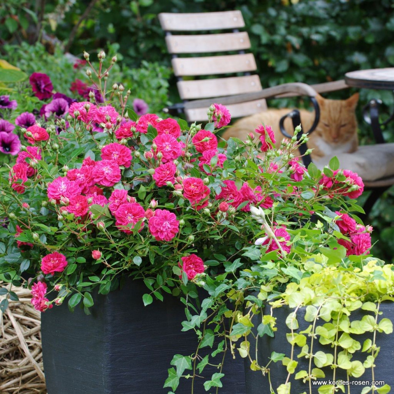Roxy Rose gehört zur Kordes Lilliputs-Kollektion von Miniaturrosen. Sie ist eine neue Generation von Rosen mit niedrigem Wuchs und einer Flut von Blüten. Roxy bietet fantastische purpurrosa Blüten, sie sind gefüllt und klein - ca. 4 cm im Durchmesser, aber die Menge macht die Größe wett, da sie von Juni bis zum Spätherbst eine große Anzahl von ihnen in vielen Stadien bietet. Sie duften nicht. Die Blätter sind ebenfalls klein, tiefgrün, glänzend, gesund und bleiben bis zu harten Frösten an der Pflanze. In milden Wintern ist der Strauch hübsch und bis Weihnachten mit ungeöffneten, aber leuchtend rosa Knospen geschmückt. Er wird etwa 40 cm hoch und die Zweige neigen dazu, sich leicht zu biegen.