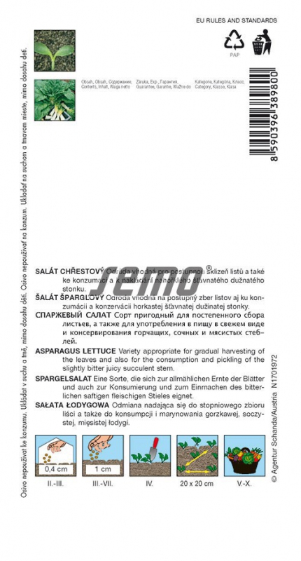 Sorte: SalatSpäte Sorte, krankheitstolerant, einfach zu wachsen. Die Blätter sind hellgrün, flach, leicht gekräuselt. Der Stiel ist grünlich-weiß, dick, hoch, das Fruchtfleisch ist grünlich, knackig und saftig. Der Stängel kann gekocht und eingelegt werden, die Blätter können auch als Blattsalat verwendet werden, wobei die Blätter nacheinander geerntet werden. Aussaat im Beet von März bis Juli.