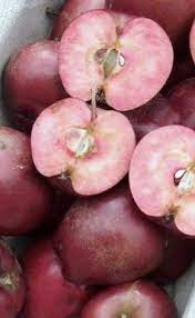 Frucht: Rotfleischige, mittelgroße, süße Apfelsorte