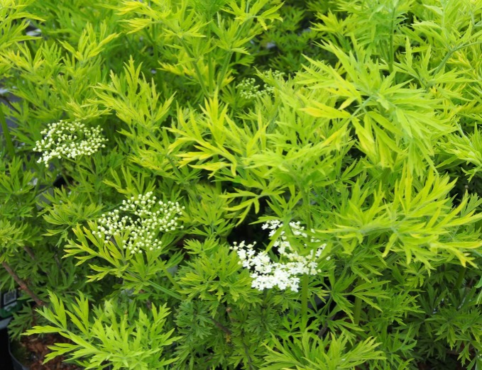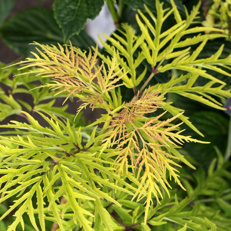 Eine brandneue Sorte des Schwarzen Holunders, die mit einer Bronzemedaille ausgezeichnet wurde. Schon der Name sagt viel über das Aussehen dieser Sorte aus. Er hat gold-grüne Blätter. Die Blüte ist weiß und hat einen säulenförmigen Wuchs mit einer maximalen Breite von 80 cm. Da es sich um eine goldblättrige Sorte handelt, ist ein Standort außerhalb der Sommerhitze zu empfehlen.