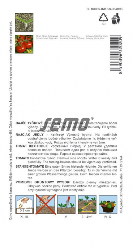 Sorte: TomateHalbharte Kunststoffhybride mit vielseitiger Verwendung und stabilen Erträgen. Die 80-100 g schweren Früchte sind kugelförmig bis flachkugelförmig, glatt, bei Reife dunkelrot. Benötigt ein ausgewogenes Feuchtigkeitsregime, um ein Aufplatzen der Früchte zu verhindern.