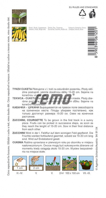 Sorte: ZucchiniHybride Zucchini mit ungewöhnlich goldgelben Früchten. Ausgezeichneter Geschmack, süßlich, kompakt, mit höherem Beta-Carotin-Gehalt. Junge Blätter haben bei niedrigen Temperaturen eine ausgeprägte gelbe Farbe, die ein Sortenmerkmal ist und den Ertrag nicht mindert. Im späteren Stadium sind die Blätter dunkelgrün. Die Wachstumszeit bis zur ersten Ernte beträgt 60-65 Tage. Spon 120-150×80 cm.