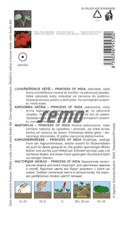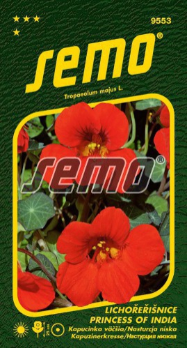 Sorte: KapuzinerkresseEine schnell wachsende einjährige Pflanze mit runden, schildförmigen Blättern. Sie blüht mit gespornten, kurzröhrigen Blüten, die auch als ungewöhnliche, sehr schmackhafte Beilage für Gerichte und Salate bekannt sind. Aufgrund ihres bakteriziden Gehalts hilft sie bei inneren Infektionen, insbesondere der Harnwege und Nieren, und stärkt die allgemeine Immunität des Körpers. Die Kapuzinerkresse eignet sich für Beetbepflanzungen, Fensterumrandungen und Ziergefäße. Er benötigt einen ärmeren, durchlässigen Boden und einen sonnigen Standort. Nicht mit Stickstoff überdüngen, das würde das vegetative Wachstum auf Kosten der Blüte fördern. Eine Sorte mit scharlachroten Blüten und dunkelgrünen Blättern mit einem rötlichen Schimmer. Eine niedrig wachsende Pflanze, die sich für Beeteinfassungen und größere Gefäße eignet. Sie bildet einen guten Kontrast zu allen gelb blühenden einjährigen Pflanzen.