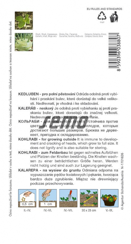 Sorte: KohlrabiHybride, weiße, halbharte Sorte für den Feldanbau. Große, schmackhafte Augäpfel widerstehen dem Knacken und schrumpfen nicht. Die Wachstumszeit ab Aussaat beträgt 85 Tage.